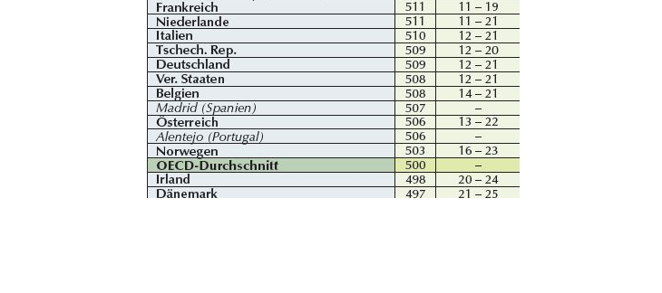 In Deutschland dagegen nicht. Die 15-Jährigen in Deutschland blieben hinter den Erwartungen zurück, die nach den Ergebnissen des Vorjahres in Mathematik, Lesen und Naturwissenschaften möglich schienen. Dies gilt laut OECD vor allem für das schwächste Drittel: Von diesen erreichen fast 20 Prozent nicht einmal das Basisniveau (Level zwei). In Japan und Korea sind dies weniger als sieben Prozent. Zu den leistungsstärksten Problemlösern (Level fünf und sechs) gehören in Deutschland rund 13 Prozent der 15-Jährigen. In Japan und Korea sind dies aber deutlich mehr als 20 Prozent. Dabei schneiden Schüler besser als Schülerinnen ab. In der Spitzengruppe sind in Deutschland zu 60 Prozent Jungen und nur zu 40 Prozent Mädchen vertreten.