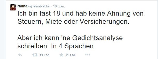 Angestoßen hatte das Thema Anfang Januar die Kölner Gymnasiastin Naina, die ihren Frust über die fehlende Alltagstauglichkeit schulischer Bildung unter dem Namen @nainablabla mit folgenden Worten in die Netzwelt zwitscherte: