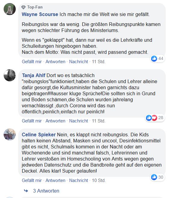 Interessant ist ja, dass das gesamte Schulministerium seit Beginn der Coronamaßnahmen im Homeoffice ist, nach dem Motto: “Seid nicht feige, lasst mich hinterm Baum.”