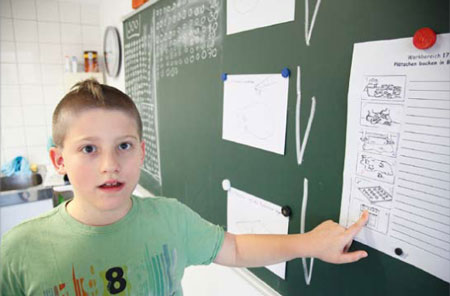 Es ist Freitag, kurz nach 12 Uhr, und in der Euskirchener Förderschule steht Plätzchen backen auf dem Stundenplan. An der Tafel hängen kleine Bilder, die zeigen, was Fabian, Ben und ihre Mitschüler machen müssen, damit aus Mehl, Zucker, Butter und Eiern tatsächlich Plätzchen werden. “Autisten lernen sehr häufig visuell”, erklärt Schmidt. Deswegen stellt sie Aufgaben immer auch in Form von Bildern. Auch die Verhaltensregeln und die Stundenpläne hängen als Piktogramme an der Wand. Die übersichtlichen Stundenpläne haben noch eine andere, für Autisten unentbehrliche Funktion: Sie geben ihnen Struktur. “Alles, was Struktur gibt, bedeutet für Autisten Sicherheit. Je mehr Struktur, desto besser.” Fabian und seine Mitschüler haben für jedes Fach einen farbigen Schnellhefter, der einen festen Platz in der Klasse hat. Sie sitzen stets am gleichen Platz, und eine spezielle Uhr hilft ihnen, den Überblick über die Stunde zu behalten. Auch die ersten beiden Unterrichtsstunden sowie die Zeiten für Pausen und Mittagessen verändern sich nie. Steht eine neue Sitzordnung oder ein Ausflug an, sollte dies frühzeitig angekündigt werden, empfiehlt Schmidt.