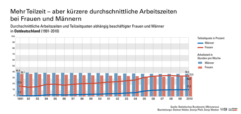 Da von sehr langen Arbeitszeiten vor allem Männer, von sehr kurzen ganz überwiegend Frauen betroffen sind, hat diese Entwicklung dazu beigetragen, dass die Arbeitszeit-Schere zwischen den Geschlechtern weiter aufgegangen ist: 2010, so die aktuellsten vorliegenden Daten, arbeiteten weibliche Erwerbstätige im Durchschnitt 30,6 Stunden pro Woche – 9,5 Stunden weniger als männliche Erwerbstätige. 1991 hatte der Unterschied noch weniger als sieben Stunden betragen. Im gleichen Zeitraum stieg die Quote der Frauen mit sehr kurzen Teilzeitjobs von 5,8 auf 13,9 Prozent (Männer: 0,7 auf 3,8 Prozent). Das zeigt eine Auswertung im neuen WSI GenderDatenPortal des Wirtschafts- und Sozialwissenschaftlichen Instituts (WSI) in der Hans-Böckler-Stiftung.