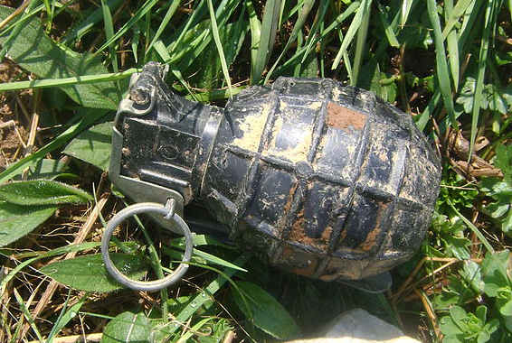 Handgranate, hier mit Sicherungsring – und explosivem Inhalt. Foto: MoserB / Wikimedia Commons