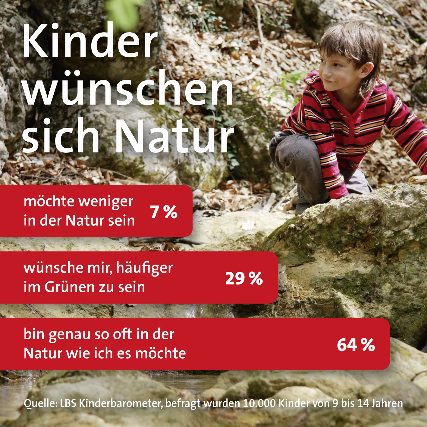 Befragt wurden 10.000 Kinder im Alter von 9 bis 14 Jahren. Fast zwei Drittel sind genauso häufig draußen in der Natur wie sie es wünschen. Aber ein knappes Drittel (29 Prozent) wäre gerne häufiger in der Natur. Nur sieben Prozent geben an, dass sie gerne seltener in der Natur wären. Unterschiede zwischen Land- und Stadtbewohnern sind nicht festzustellen. Auch zwischen den Bundesländern gibt es keine Abweichungen. Unter den Kindern, die sich weniger Zeit in der Natur wünschen, finden sich mehr Jungen als Mädchen.