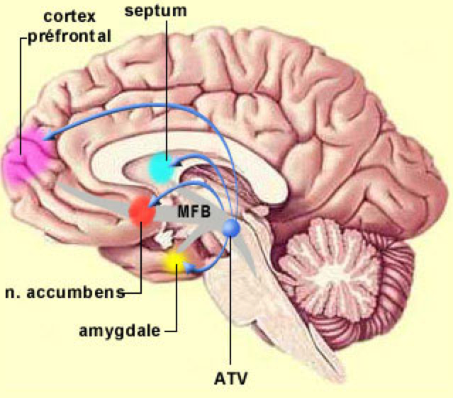 Der nucleus accumbens (rot) spielt eine zentrale Rolle im Belohnungssystem des Gehirns und bei der Suchtentstehung. Bild: lecerveau.mcgill.ca / Wikimedia Commons