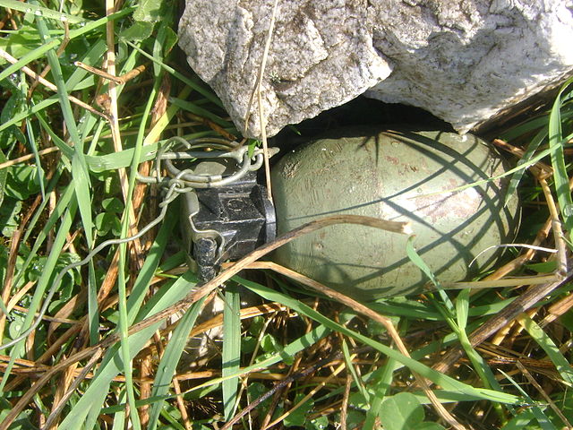 Ihre erste Handgranate hat Beimel während ihrer Ausbildung gesehen – hier eine Jugoslawische Handgranate M52, umfunktioniert zu Sprengfalle mit Zug-Auslösung durch Stolperdraht. (Foto: MoserB/Wikimedia public domain)