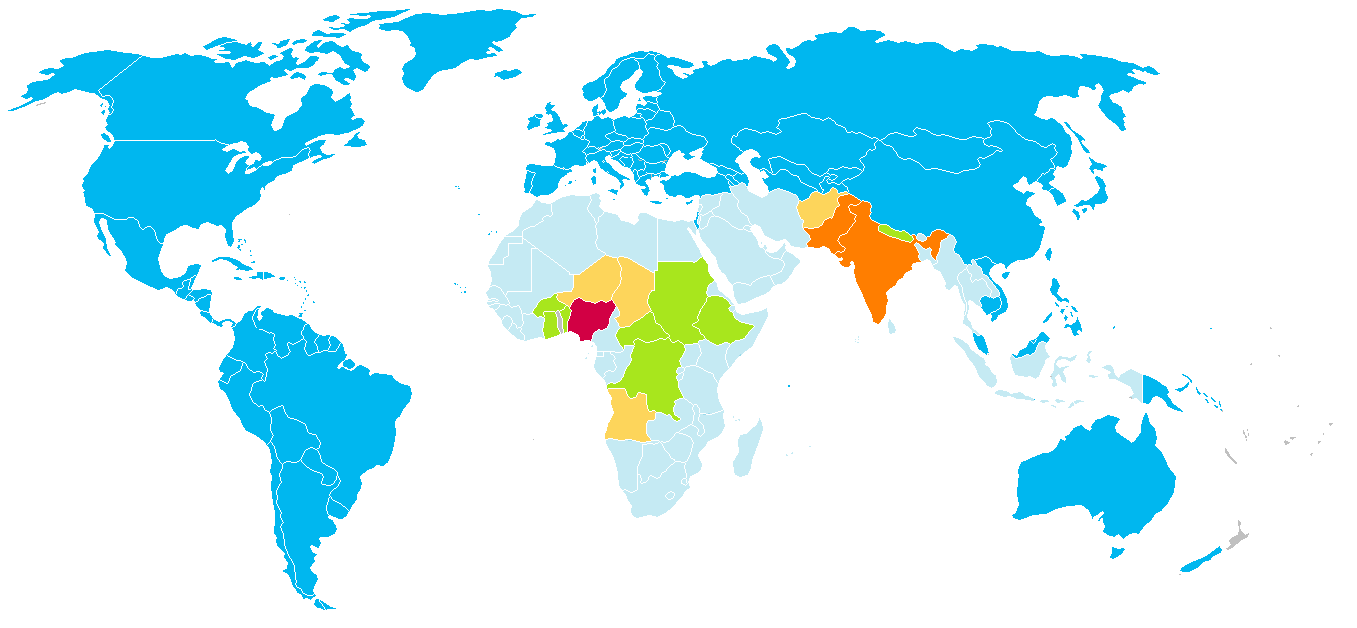 (blau) Poliovirus offiziell ausgerottet (Bild: Kokin/Wikimedia CC BY-SA 3.0)