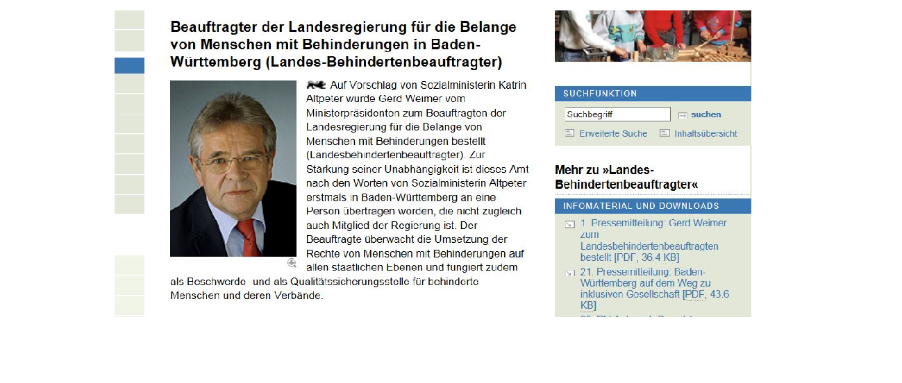 Zur Person: Gerd Weimer, 65, ist der erste unabhängige Landesbehindertenbeauftragte im Südwesten. Er ist kein Mitglied der Regierung. Der gebürtige Tübinger ist neben seinem Ehrenamt noch wenige Stunden an einem beruflichen Gymnasium in Tübingen tätig und hat selbst Erfahrungen mit der Inklusion gesammelt. Weimer wurde von Sozialministerin Katrin Altpeter (SPD) vorgeschlagen und von Ministerpräsident Winfried Kretschmann (Grüne) ernannt. Der verheiratete Vater von zwei Kindern überwacht die Umsetzung der Rechte von Menschen mit Behinderungen auf allen staatlichen Ebenen und fungiert zudem als Beschwerde- und als Qualitätssicherungsstelle für Behinderte und deren Verbände.