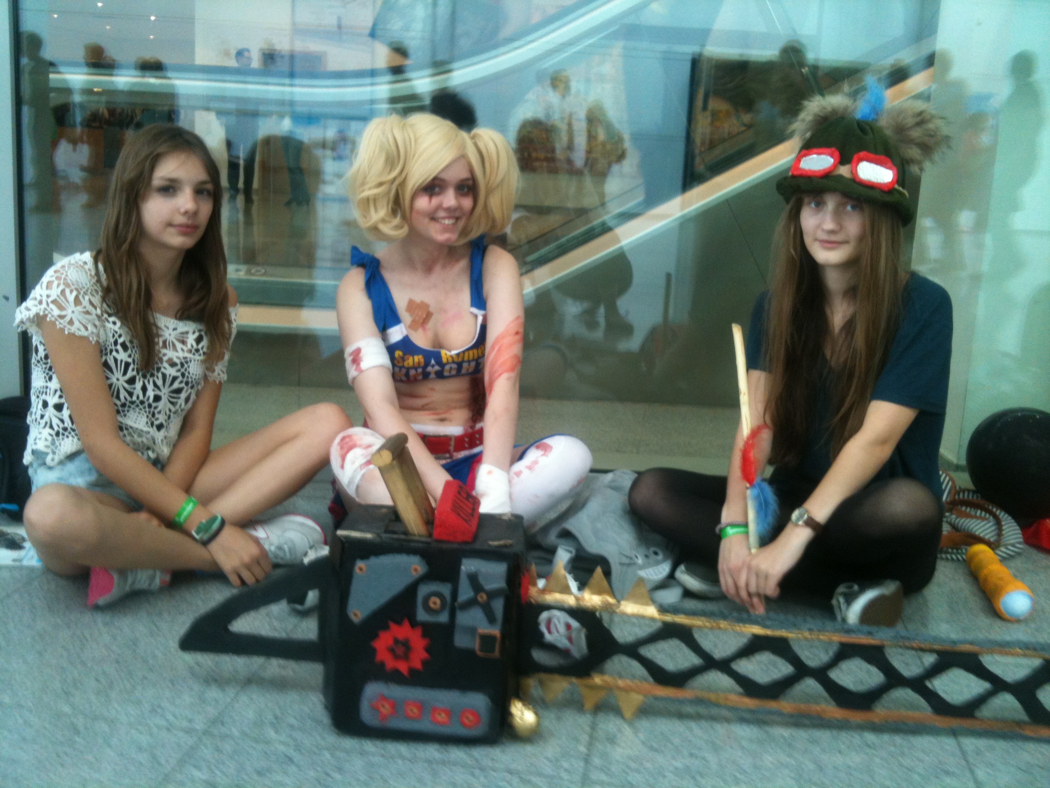 Dass hier aber nicht nur der Kommerz gefeiert wird, zeigen Besucherinnen wie Charlotte, Lilly und Regula. Für die Mädchen ist das Spielen auf der Messe nicht wichtig. Die drei Kölnerinnen sitzen auf dem Boden vor Halle 8 und warten auf den Youtube-Spielekritiker „Lefloid“, der hier rumlaufen soll. Charlotte hat ihre selbst gebastelte Kettensäge aus bemalter Spanplatte und einer Fahrradkette vor sich abgelegt, sie geht heute als Cheerleaderin Juliet aus dem Spiel „Lollipop Chainsaw“, die ihre Schultage damit verbringt, Zombies zu bekämpfen. Charlottes Körper und ihr knappes Outfit sind dementsprechend mit Blut- und Kampfesspuren bedeckt. „Wir sind hier wegen der interessanten Leute und wegen der Partyatmosphäre“, sagt die 19-jährige. Ihre Freundin Lilly ist als Teemo aus dem Spiel „league of legends“ verkleidet. Heute sind die Mädchen in eher einfachen Kostümen unterwegs, Lilly trägt nur einen grünen Filzhut und einen Stab, in Charlottes Wohnung hängt aber noch ein Fantasykostüm, an dem sie fast elf Monate gebastelt hat.