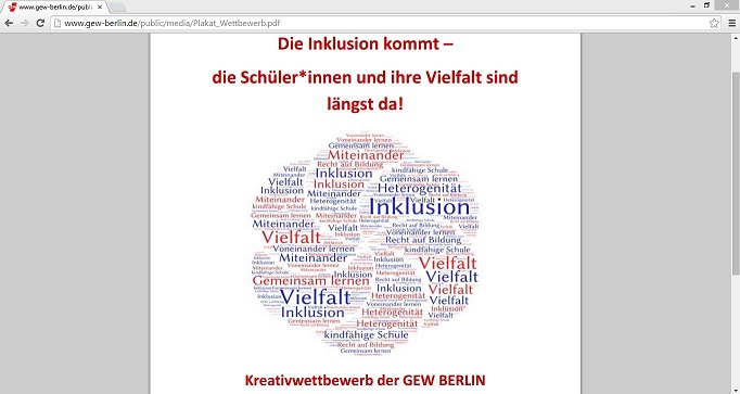Pädagogen erlebten, dass die Einführung der inklusiven Schule ständig verschoben werde, so die Gewerkschaft. Die Schüler und ihre Vielfalt seien aber längst da. Immer mehr Pädagogen müssten sich den Herausforderungen schon jetzt stellen. Alle Schulen müssten daher zu einem Ort werden, an dem alle Schüler mit ihren verschiedenen Fähigkeiten, Bedürfnissen und Persönlichkeiten ihren Raum bekommen. „Dafür braucht es gute Rahmenbedingungen – Qualifizierung, Geld, Zeit, multiprofessionelles Personal, Material, Hilfsmittel und Räume. Mit dem Kreativwettbewerb wollen wir die Realität abbilden und Forderungen an die Politik formulieren. Die inklusive Schule in Berlin braucht nicht nur den erklärten politischen Willen, sondern auch politisches Handeln“, so die GEW.