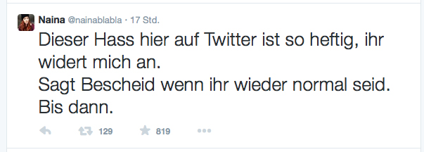 Am Freitag sagte Naina im «Kölner Stadt-Anzeiger», sie werde auf ihrem Account nicht mehr twittern, bis sich «die ganze Sache wieder gelegt hat». Sie habe viele Kommentare erhalten, die weit unterhalb der Gürtellinie lägen. «Diesem Stress will ich mich nicht auch noch aussetzen.»