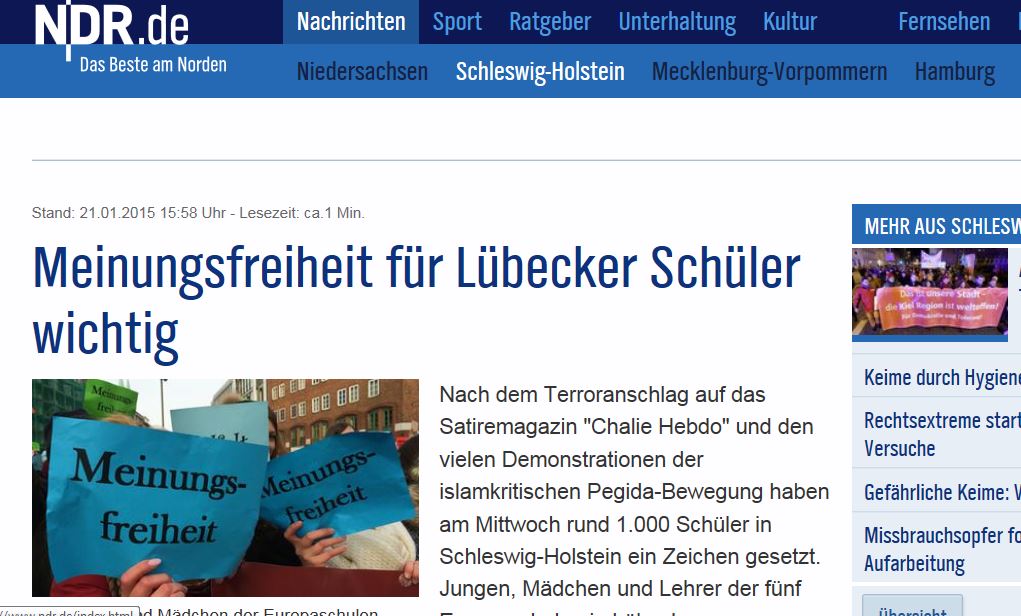 LÜBECK. „Nach dem Terroranschlag auf das Satiremagazin ‚Chalie Hebdo‘ und den vielen Demonstrationen der islamkritischen Pegida-Bewegung haben am Mittwoch rund 1.000 Schüler in Schleswig-Holstein ein Zeichen gesetzt“, so berichtete der NDR in der vergangenen Woche. „Jungen, Mädchen und Lehrer der fünf Europaschulen in Lübeck demonstrierten auf dem Klingberg für Meinungsfreiheit, Toleranz und Respekt.“. Doch: Wie frei waren die Schüler bei ihrer Demonstration für die Meinungsfreiheit? Offenbar empfanden viele Kinder und Jugendliche die Aktion als schulische Pflichtveranstaltung.