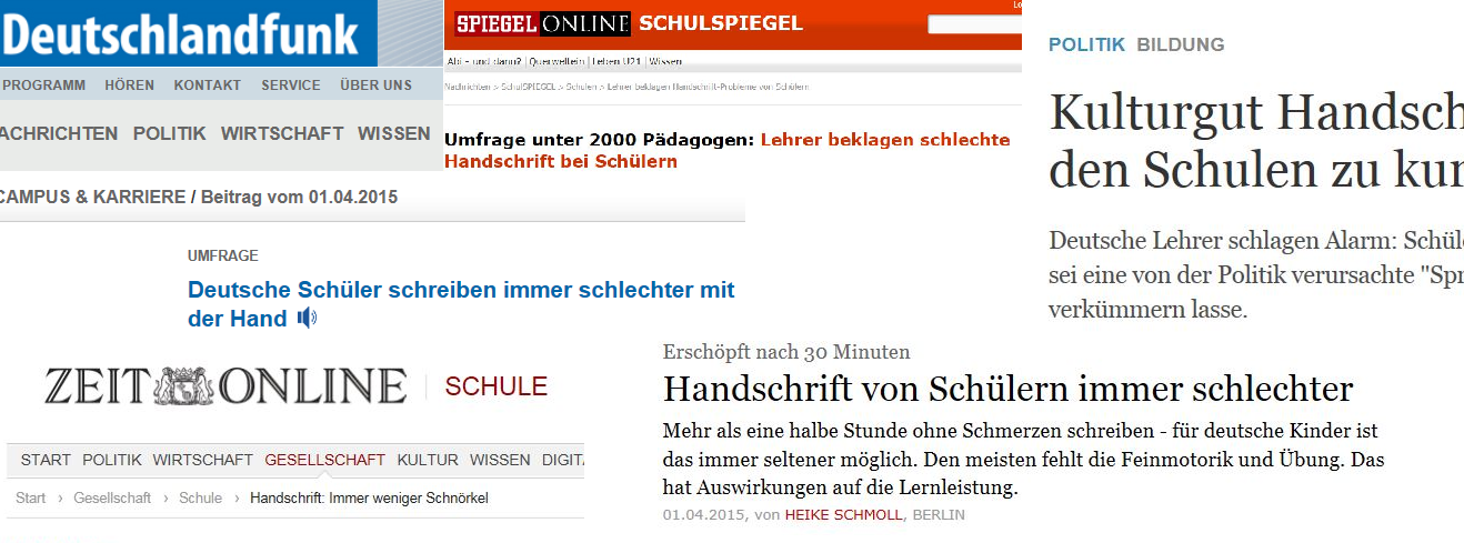 Der „Kölner Stadt-Anzeiger“ bemerkt: „Johann Wolfgang von Goethe hatte es gewusst: Handgeschriebene Zeilen haben einen eigenen Wert. ‚Ich habe seit einiger Zeit eine Sammlung sogenannter Autographen angelegt‘, schrieb er 1806 einem Freund, ‚daß ich nämlich suche und wünsche, von bedeutenden Männern der gegenwärtigen und vergangenen Zeit ein eigenhändig Geschriebenes zu erhalten und zu besitzen.‘ Mit ebendieser Fähigkeit, eigenhändig etwas zu schreiben, haben deutsche Schüler im Jahr 2015 große Schwierigkeiten.“ News4teachers