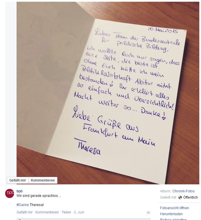 Die Diskussion, die sich anschließend entspinnt, ist voller Lob und konstruktiver Kritik. Beispielsweise: „Die bpb ist nur für die Oberstufe interessant. Für die sek I Ist das Material viel zu überfrachtet und ungeeignet.“ Antwort: „Wir arbeiten daran, unsere Angebote für die Sek I auszubauen: bpb.de/lernen/zielgruppe/sekundarstufe-1“. Auch wir, die News4teachers.de-Redaktion, will diese Gelegenheit nutzen und die Bundeszentrale für politische Bildung loben. Eurer Angebot ist toll, umfangreich und nützlich. Und außerdem seid ihr noch nicht mal humorlos, was der Kommentar „Bevor es hier noch drei Mal kommt: Wer Rechtschreibfehler in Theresas Karte findet, darf sie behalten. Danke!“ beweist. nin