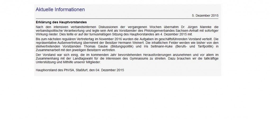 Mannke hat das Vertrauen des Philologenverbands Sachsen-Anhalt verloren und kann deshalb nicht mehr für dessen Mitglieder sprechen. Er verlässt ein Amt, für das beiderseitige Loyalität unabdingbar ist. Das ist alles. So geht dem Schulleiter vom Goethe-Gymnasium in Weißenfels eine sicher ganz nett dotierte Nebentätigkeit flöten. Mehr aber auch nicht. Er bleibt Schulleiter, er bleibt Lehrer, er bleibt Landebediensteter. Seine Existenz ist nicht gefährdet – anders als die derjenigen übrigens, über die er so flott in seinem Artikel „Flüchtlingsdebatte: Anpassung an unsere Grundwerte erforderlich“ in der Zeitschrift des Philologenverbandes Sachsen-Anhalt geschrieben hatte.