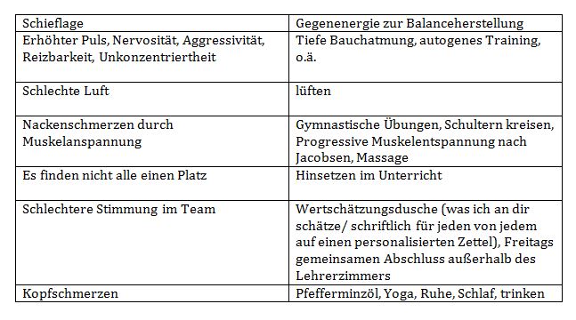 Nehmen wir eine der Belastungsfaktoren aus der oberen Liste, zum Beispiel „Zu enges und lautes Lehrerzimmer“.