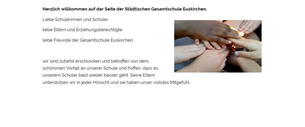 Nach der lebensgefährlichen Attacke auf einen zwölfjährigen Schüler in Euskirchen hat sich die Schulleitung schockiert gezeigt. «Wir sind zutiefst erschrocken und betroffen von dem schlimmen Vorfall an unserer Schule und hoffen, dass es unserem Schüler bald wieder besser geht», heißt es auf der Homepage der Gesamtschule. «Seine Eltern unterstützen wir in jeder Hinsicht und sie haben unser vollstes Mitgefühl.» Um Sorgen und Ängste der Schüler aufzufangen, sollte am Montag in allen Klassen ein spezieller Tutorenunterricht erteilt werden. Man unterstütze die Ermittlungen, könne und dürfe sich aber öffentlich nicht zum Geschehen äußern. Allerdings wurden kritische Fragen in Richtung Schule laut.