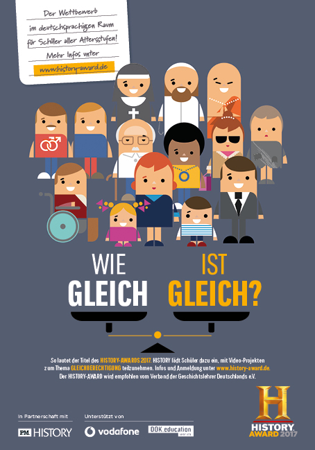 „Gleichberechtigung – Wie gleich ist gleich?“ ist das Motto des HISTORY-AWARDs 2017. Erstmals hat HISTORY den Award über Deutschland hinaus auf Österreich und die Schweiz ausgeweitet. Partner des Video-Wettbewerbs für Schüler aller Altersstufen und Schularten ist P.M. History. Der HISTORY-AWARD wird unterstützt von Vodafone und DOK.education und empfohlen vom Verband der Geschichtslehrer Deutschlands e.V. (VGD). Projekte können bis zum 28. April eingereicht werden. Der Award und das von Vodafone gestiftete Preisgeld werden Mitte Juni 2017 verliehen.