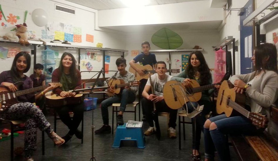 Die sprachliche Verständigung ist kein Problem und die Jugendlichen Gitarrenschüler machen gute Fortschritte. Bild: Musikbrücke e.V.