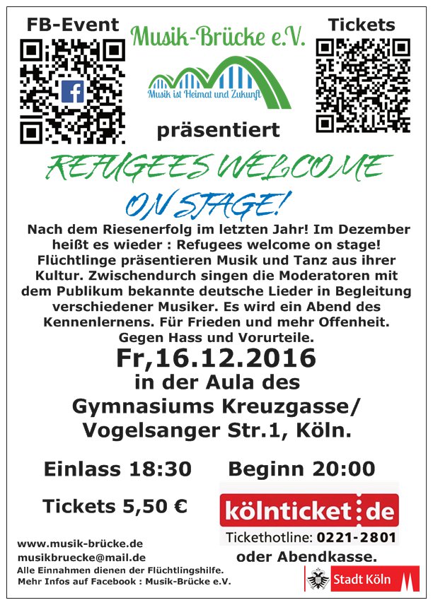 Auf jedem Fall von meinem Musiklehrer. Aber leider nicht in anderen Fächern. Da sind die Lehrer knallhart geblieben. Ich hab es zum Glück am Ende noch geschafft, sogar ohne ein Defizit. Dieses Jahr sieht’s ein bisschen anders aus mit den Noten. Was aber gar nichts mit dem Konzert zu tun hat, weil es um einiges stressfreier ist: Ich habe schon Kontakte und Flüchtlinge schreiben mir zum Teil von selbst, dass sie auftreten wollen. Das heißt die Situation ist beinahe umgekehrt zum letzten Jahr: Die Leute kommen auf mich zu und ich muss weniger nachfragen und rumrennen. Naja, hoffen wir mal, dass es wie letztes Jahr klappt.