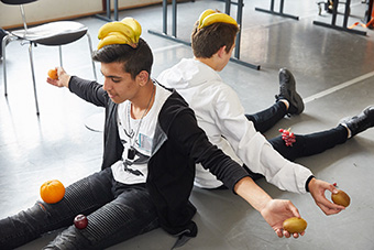 Viel praktische Arbeit erwartete auch die Teilnehmer des Projekts „Selbstgewürzt – Eat Art“ von Sara Schwienbacher, Performancekünstlerin und wissenschaftliche Mitarbeiterin an der Hochschule für Künste im Sozialen in Ottersberg. Im Mittelpunkt stand die Kunst aus beziehungsweise mit Obst, wie etwa selbst entwickelte One-Minute-Sculptures. „Das Herz aus Obst“ formten Andrea Zipfel, Lehrerin aus Rheinland-Pfalz, und Claudia Schurmann, Lehrerin aus Brandenburg, mit ihren Armen, indem sie an den Verbindungspunkten oben und unten jeweils gemeinsam ein Stück Obst festhielten. Ihr erster Eindruck? „Ich begleite eigentlich nur eine Kollegin und bin positiv überrascht“, so Andrea Zipfel. Ihre Teampartnerin Schurmann ergänzte: „Dass wir gleich praktisch arbeiten, das gefällt mir gut. Und über die Herkunft von Obstsorten oder ihre unterschiedlichen Namen haben wir direkt eine Verbindung zu unterschiedlichen Kulturen gehabt.“ Gerade das Selbsterleben, betonte Workshop-Leiterin Schwienbacher, ermögliche Integration: „Es schlägt eine Brücke, weil man nicht viele Worte braucht.“