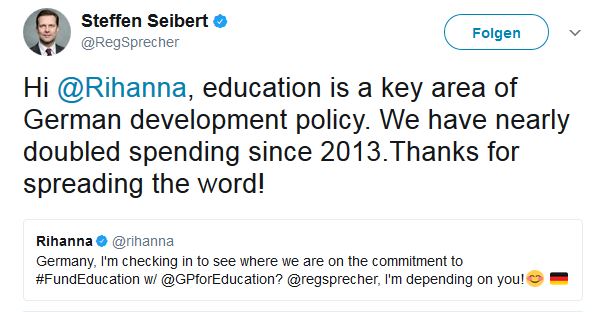 BERLIN. R&B-Sängerin Rihanna hat sich via Twitter an die Bundesregierung gewandt, um sich nach Deutschlands Engagement beim Thema Bildungsinvestitionen in Entwicklungsländern zu erkundigen. «Ich verlasse mich auf Sie», schrieb die 29-Jährige an Regierungssprecher Steffen Seibert. Hinter ihren Tweet setzte Rihanna einen Smiley mit roten Wangen und eine Deutschlandfahne. Seibert antwortete am Samstag: «Hi, @Rihanna, Bildung ist ein Schlüssel deutscher Entwicklungspolitik. Wir haben seit 2013 unsere Ausgaben fast verdoppelt. Danke fürs Weitersagen!»