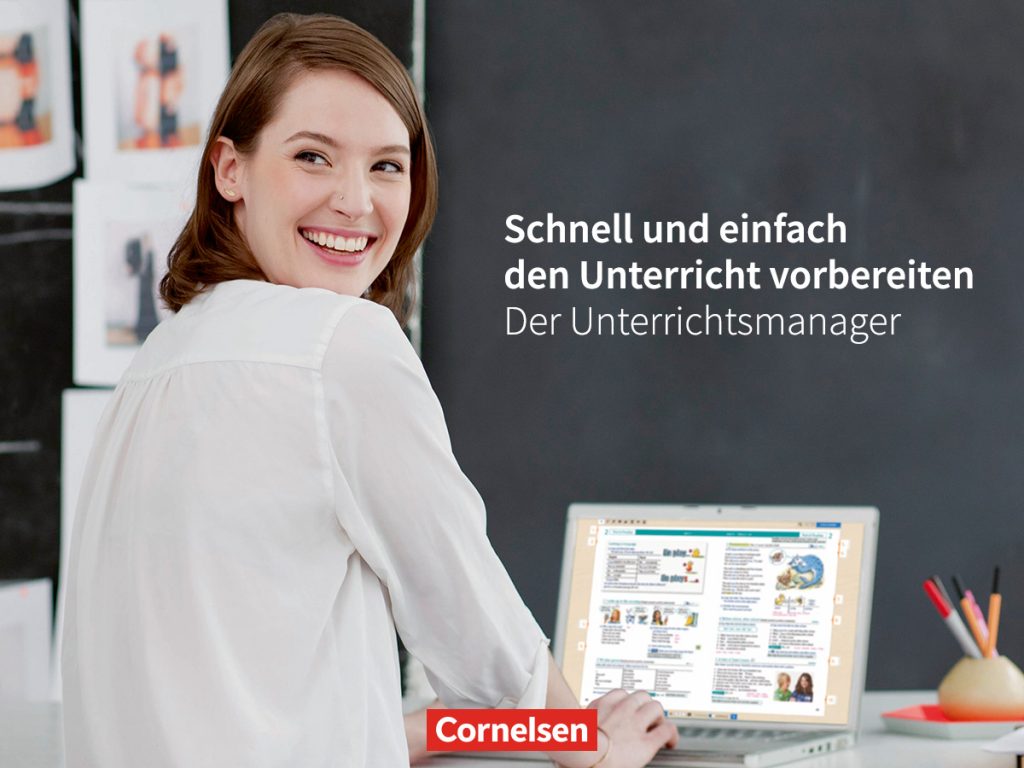 Der Unterrichtsmanager vereint Ihr Cornelsen Schulbuch als E-Book und alle zugehörigen Begleitmaterialien, wie Handreichungen und Arbeitsblätter, Kopiervorlagen und Folien, Lösungen und Bewertungsraster oder Audio-Dateien und Videos. Die Unterrichtsvorbereitung funktioniert damit genau wie sonst, nur eben digitalund dabei schneller, übersichtlicher und mit vielen praktischen (Zusatz-)Funktionen.