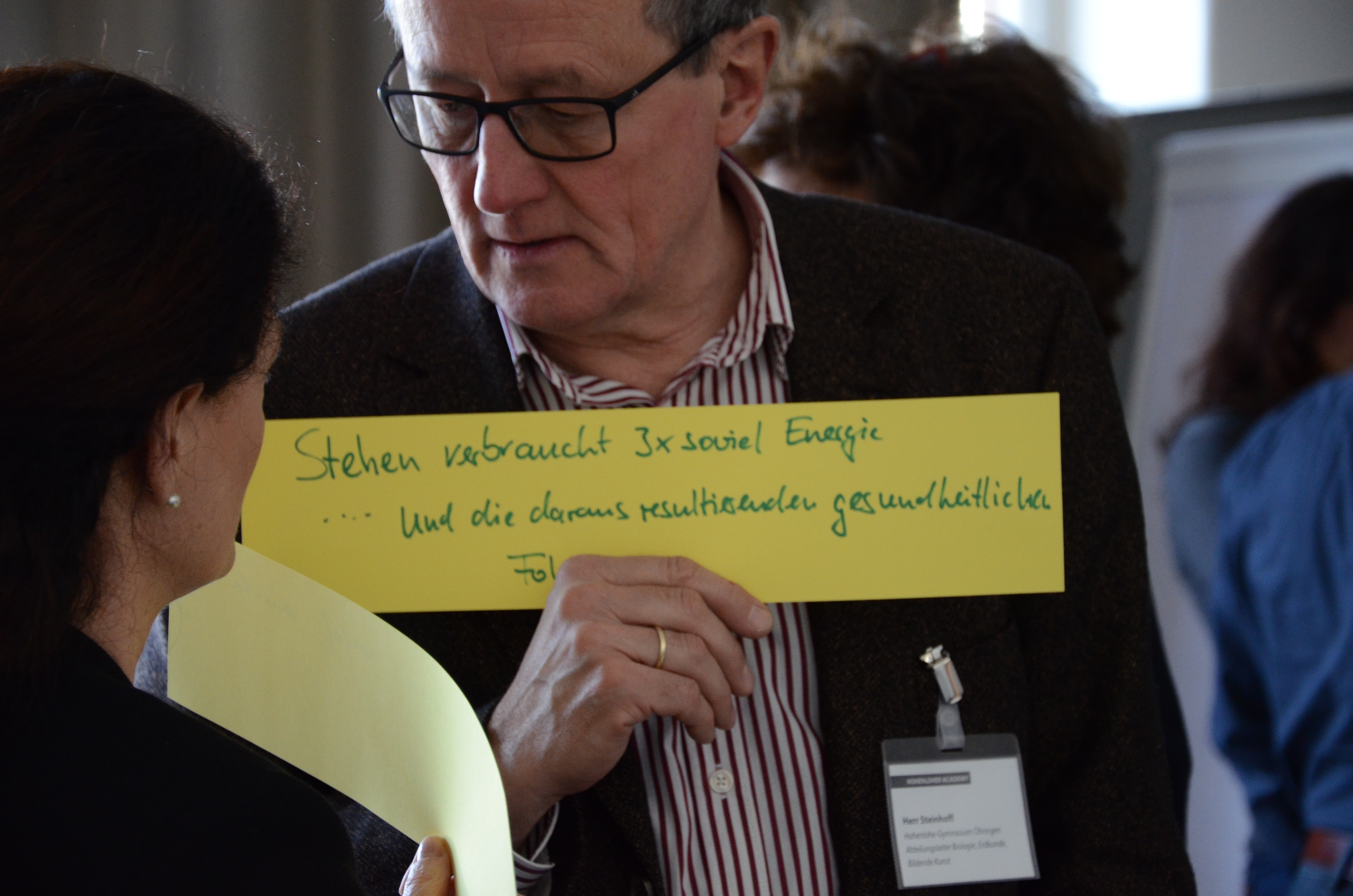 Im  zweiten Impulsvortrag widmete sich Dr. Robert Rupp von der PH Heidelberg neuesten Erkenntnissen zu  „Weniger sitzen – besser lernen“. Mit einer einfachen Frage holte er die Teilnehmer mitten ins Thema. „Schließen Sie die Augen und stellen Sie sich Ihre Schüler vor. Wer von Ihnen sieht die Klasse sitzend vor sich?“ Fast alle Hände gehen nach oben. Der Einwurf „Der Rest sind wohl Sportlehrer.“ entlockt lautes Schmunzeln. Laut Studien verbringen Kinder und Schüler 71 % ihrer Wachzeit im Sitzen. Das sollte uns alle eigentlich „vom Hocker hauen“ – uns wach rütteln. Die gesundheitlichen Auswirkungen kann man sich leicht ausmalen: Diabetes Typ 2, Herz-Kreislauf-Erkrankungen, Depressionen, Angst um nur einige zu nennen. Bei Kindern werden darüber hinaus Zusammenhänge zu negativem Selbstwertgefühl, schlechten Noten, Übergewicht und natürlich dem Fitnesszustand festgestellt.