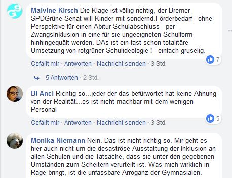 Zitat: “Das Bildungsressort sieht sich trotzdem im Recht […] In Bremen gebe es immer mehr Kinder mit Beeinträchtigungen, für die das Bildungsressort Schulplätze schaffen müsse. Dabei gehe es nicht nur um schwer geistig behinderte Kinder, sondern auch um welche mit körperlichen Behinderungen, Autisten und Inselbegabungen. Auch diese hätten ein Anrecht auf Unterricht an einer Schule in der Nähe.”