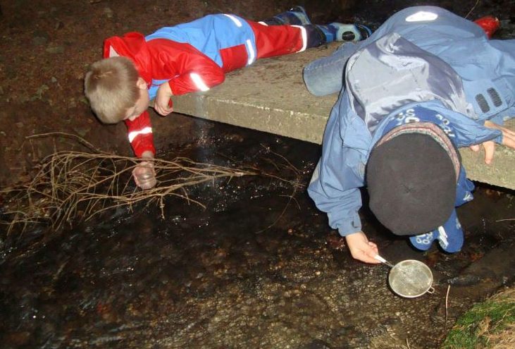 Im Mittelpunkt steht das Phänomen der Strömung. „Als erstes lernen die Kinder, sehr genau hinzusehen, richtig zu beobachten“, erklärt Anja Großert. Dafür verbringen sie einen Nachmittag an einem nahegelegenen Bach. Sie fotografieren das fließende Gewässer, suchen mit einer Becherlupe nach den dort lebenden Tieren und erfahren, dass diese sich unter Steinen vor der Strömung verstecken. Aufbauend auf diesen Naturerfahrungen müssen sie das Prinzip der Strömung selbstständig umsetzen, etwa indem sie mit ihren Händen einen Bachlauf simulieren und diesen anschließend in Kleingruppen mit Knete nachbauen. „Das Programm ist spielerisch angelegt, hat aber einen festgelegten Ablauf, bei der jede Stufe auf der vorhergehenden aufbaut“, sagt die Umweltpädagogin. „Die Schülerinnen und Schüler sind forschend aktiv, jede Erfahrung führt sie zur nächsten.“ So entdecken sie auch – unterstützt, aber selbstständig –, dass sich das Naturphänomen der Strömung auf weitere Bereiche übertragen lässt, zum Beispiel die Luft.