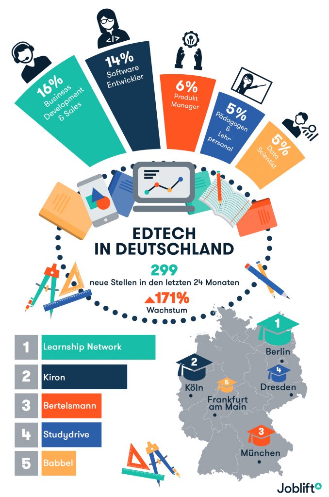 Zur Hauptstadt des Bildungstechnologiesektors entwickelt sich vor Köln mit 14 % und München mit 8 % der Inserate wenig überraschend Berlin: Dort entstehen nicht nur 30 % der Stellen, auch drei der fünf am schnellsten wachsenden EdTech-Unternehmen sind in Berlin ansässig. Trotzdem entwickelt das in den letzten zwei Jahren meistausschreibende Unternehmen Learnship Network seine E-Learning Sprachkurse in Köln. Auf Platz zwei des Rankings findet sich Kiron, ein social Start-up, das Geflüchtete durch digitale Lernangebote den Weg zur Hochschulbildung erleichtern möchte. Darauf folgen die Bertelsmann Education Group sowie Studydrive, eine Plattform für Studierende, und auf Platz fünf schließlich Babbel, ein Portal für Online-Sprachunterricht. Auffällig ist auch, dass alle fünf Unternehmen sich fast ausschließlich mit Erwachsenenbildung befassen – dieser Markt scheint in Deutschland einfacher zu erschließen und letztendlich wahrscheinlich profitabler zu sein als Lösungen, die das staatliche (und kostenfreie) Bildungssystem ergänzen sollen oder gar mit ihm konkurrieren. News4teachers