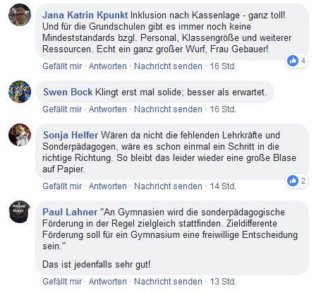 Kritik: Interessenvertreter und Opposition kritisieren die Neuerungen teils als ungenügend und enttäuschend. Mehrere von ihnen stören sich am Erhalt der Förderschulen. Dringend notwendige, zusätzliche Ressourcen kämen erst ab 2019/20 – und dann nur für die Jahrgänge ab der fünften Klasse, sagte etwa die bildungspolitische Sprecherin der Grünen-Landtagsfraktion, Sigrid Beer. «Das sind keine Eckpunkte zur Förderung der Inklusion, das ist Politik zur Stärkung der Förderschulen.» «Die geplanten Förderschulgruppen an allgemeinbildenden Schulen fördern nicht die Inklusion, sondern die Ausgrenzung», sagte der bildungspolitische Sprecher der SPD-Landtagsfraktion, Jochen Ott.