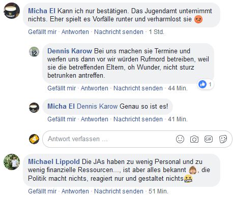 Unser Jugendamt reagiert auch kaum, spielt Missstände herunter. Wenn Brot und ungesundes “Müsli” im Haushalt herumstehen und für die Kinder jederzeit verfügbar sind, ist die Ernährung ausreichend und wir haben zu schweigen. Von hygienischen Verhältnissen, die wir anprangern, erzähle ich lieber nichts.