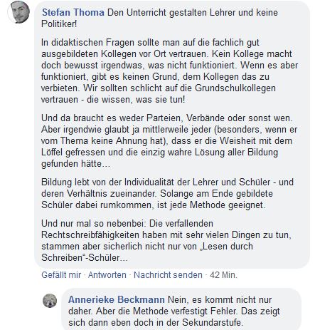 Medidinger vom DL hält dagegen: «Die Bonner Studie gibt klar Hinweise, dass Schreiben nach Gehör nicht zu der angestrebten Rechtschreibkompetenz der Schüler führt.» Es gebe keinen Grund zur Vermutung, dass die Studie unwissenschaftlich sei, die Ergebnisse sollten ernst genommen werden. «Lehrkräfte brauchen großen pädagogischen Freiraum bei der Wahl der Methoden. Die Grenze ist aber erreicht, wenn das Lernziel nicht geschafft wird.»