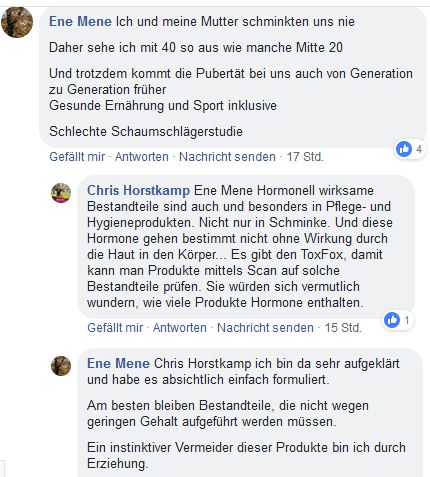 Zusammenhänge fanden die Wissenschaftler auch zwischen der Belastung von Kindern und dem Einsetzen der Pubertät: So gingen sehr hohe Konzentrationen von Methylparaben im Urin der Mädchen mit einer früheren Entwicklung der Brustdrüsen und einer frühen ersten Menstruation einher. Gleiches galt für Propylparaben und die Entwicklung der Schambehaarung. Bei sehr hohen Werten dieser Substanzen begannen die Entwicklungen im Mittel etwa vier bis sieben Monate früher. Bei Jungen fanden die Forscher eine deutliche Verbindung nur für Propylparaben: Eine sehr hohe Konzentration der Substanz ging mit einer früheren Reifung der Geschlechtsorgane einher.