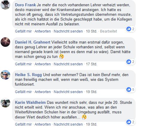 Die neueren Statistiken mit der neuen Landesregierung sollen ausführlicher sein, aber was soll das bringen? Glaubt man wirklich, dass weniger Unterricht ausfällt, wenn man es ausführlich dokumentiert? Wieviel Prozent der deutschen Arbeitnehmer sind im Schnitt gleichzeitig krank, waren es 5-7% oder sowas? Das ist doch klar, dass dieser Anteil als absolutes Minimum an Reserve vorhanden sein müsste.