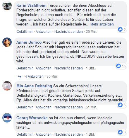 Und – um den sich hier ja auch immer gerne sich meldenden Herrn Wocken anzuführen: Die Sonderpädagogen in den Bildungsministerien scheinen ohnehin stark am Erhalt der Föderschulen zu arbeiten – bewusst auf Kosten der Kinder.