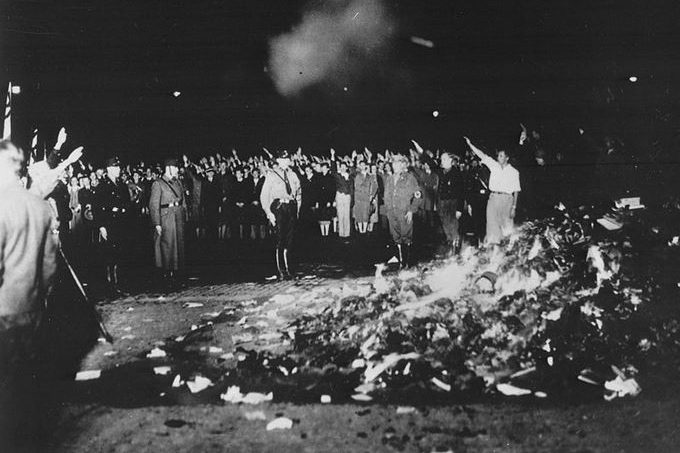 10. Mai 1933, Bücherverbrennung durch die Deutsche Studentenschaft am Opernplatz in Berlin. Foto: Bundesarchiv, Bild 102-14597 / Georg Pahl / CC-BY-SA 3.0 (Wikimedia Commons)