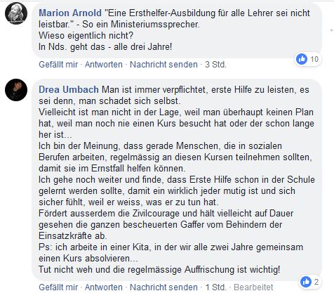Das Problem besteht doch darin, dass der Arbeitgeber respektive Dienstherr es den Kollegien gestatten müsste, die Fortbildungen als Ersthelfer während der Arbeitszeit zu machen. DAs wird aber von Schulleitungen und vorgesetzten Dienststellen ungern gesehen, da es hierdurch zu Unterrichtsausfällen kommt. Folglich wird derjenige, der den “Schein” braucht, gezwungen, die notwendige Fortbildung in der Freizeit zu machen.