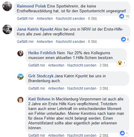 Dieser Standard der Reanimation durch Reanimationsschulungen muss doch erst noch sukzessive erarbeitet werden. die betroffenen Lehrer waren einfach mit der gesamten Situation überfordert und so werden sie selber sehr daran zu knacken haben, dass sie eben nicht in der Lage waren, das Richtige, also eine Reanimation durchzuführen. Deshalb ist sollte dieser traurige Schlag als Aufruf verstanden werden, endlich bundesweit derartige Schulungen verpflichtend in Begleitung geschulter Ärzte und Rettungsassistenten umzusetzen. Ich sehe da weniger die Lehrer in der Pflicht derartiges umsetzen.