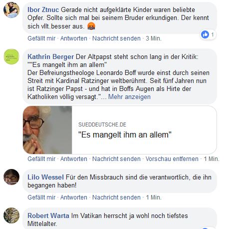 mir ist ja klar, dass im reaktionären Teil der Katholischen Kirche solche Denkmuster unterwegs sind, aber dass ein so gelehrter Kopf wie Ratzinger so blind für die Realität der kirchlichen Schuld sein kann, ist hochpeinlich.