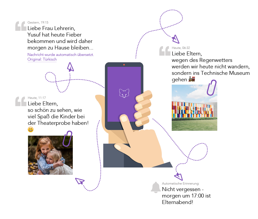 Über SchoolFox können unter anderem Nachrichten, Fotos und Dokumente versendet, Veranstaltungen und Elternsprechtage organisiert oder Umfragen durchgeführt werden. Wichtig ist, dass die Empfänger jede Nachricht aktiv bestätigen müssen und die Schule so den Überblick hat, welche Eltern oder Schüler die Nachrichten gelesen sowie bestätigt haben. Die LehrerInnen können zudem auswählen, dass sie bei einzelnen Nachrichten auch eine tatsächliche handschriftliche Unterschrift benötigen und die Empfänger können diese dann direkt auf ihrem Smartphone tätigen. Wir bieten außerdem eine Übersetzungsfunktion in rund 40 Sprachen an, mit deren Hilfe auch Eltern mit geringen oder keinen Deutschkenntnissen in den Schulalltag integriert werden können.