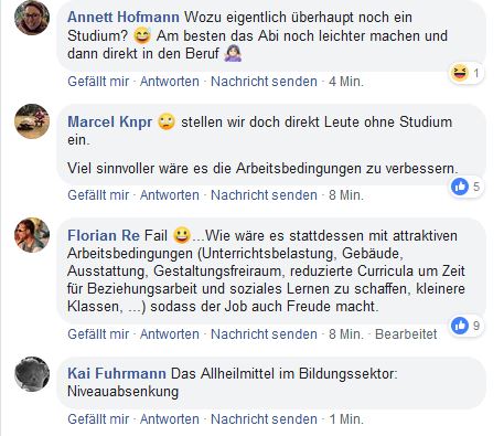 Interessant sind dann wieder die Facebook-Kommentare. Da werden wieder Dinge gefordert ohne konstruktive Vorschläge zu machen: “Kleinere Klassen” sind nur dann möglich, wenn es mehr Geld und eben mehr Lehrer gibt. Soweit denkt der ein oder andere Kollege aber nicht.