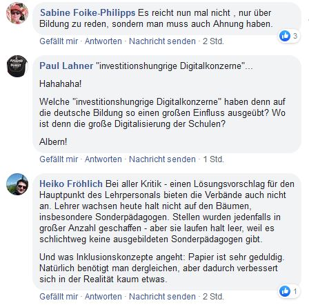 Die zunächst ohne Mittel und Planung eingeführte Inklusion wird zum Ende von Frau Löhmann von der GEW noch gerügt, aber das war es dann. Jetzt ist von Versagen und Täuschung die Rede.
