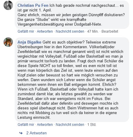 Die Kernfrage ist doch, wie eine Lehrkraft pädagogisch solche Spiele begleitet,- da muss es fair zugehen, da müssen regelbrechende Schüler sofort verwarnt werden, da kommt es auf die Pflege eines wertschätzenden, guten Klassenklimas an. Mobben kann ich nicht nur beim Völkerball, sondern auch bei allen anderen Ballsportarten. Die Forscher tun ja grade so, als ob der Völkerball ein Kind der Weltkriege und Völkerschlachten ist. Merke, nicht das Spiel ist böse, allenfalls der Mensch ist es!