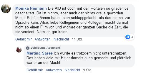 Die SPD im Landtag von Mecklenburg-Vorpommern forderte den Rücktritt des Vorsitzenden des Bildungsausschusses. Dieses Amt wird von dem AfD-Politiker Jörg Kröger ausgeübt. Der Vorsitzende der SPD-Landtagsfraktion, Thomas Krüger, nannte das Meldeportal ein «Lehrer-Petz-Portal» und einen «Internetpranger», der allein dazu diene, missliebige Schulen und Lehrer zu denunzieren. «Das erinnert fatal an die Methoden von Nazis und Stasi.» In diesem Zusammenhang finde er es unerträglich, dass der Bildungsausschuss des Landtages von einem Mitglied der AfD-Fraktion geführt wird. «Jörg Kröger hatte bereits im vergangenen Jahr diese Hetzportale verteidigt. Ich fordere ihn dazu auf, von seinem Amt zurückzutreten», sagte Krüger. Die Fraktionsvorsitzende der Linken, Simone Oldenburg, schloss sich dieser Forderung an.