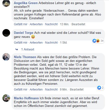 Da es wohl kein Geheimnis ist, dass vor allem in den Grund- und Hauptschulen und in den Gesamtschulen mehr Sozialarbeit vom Lehrer gefragt ist, muss man sich überlegen, wo man diese auf diesem Sektor entlasten kann, nicht nur durch Unterstützung von multiprofessionellen Teams, sondern auch durch klare Ordnungsmaßnahmen. Und dann sollte man sich einmal überlegen, warum in unserer Gesellschaft im Gegensatz zu den 80igern Jahren die ganze Sparte der Sozialberufe (und auch Pflegeberufe) für junge Leute nicht mehr attraktiv ist. Auch hier sollten Lösungen gesucht werden. Lehrer zu sein ist an vielen Schularten heutzutage ein halber Sozialberuf.