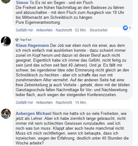 Ich fühle mich wesentlich entlastet, dass ich vieles zu Hause erledigen und selbst bestimmen kann, wann. Wäre mal interessant, wie sich die “Ewig-Unzufriedenen” fühlen würden, wenn sie täglich von 07.00 bis 17.00 Uhr in der Schule sein müssten.