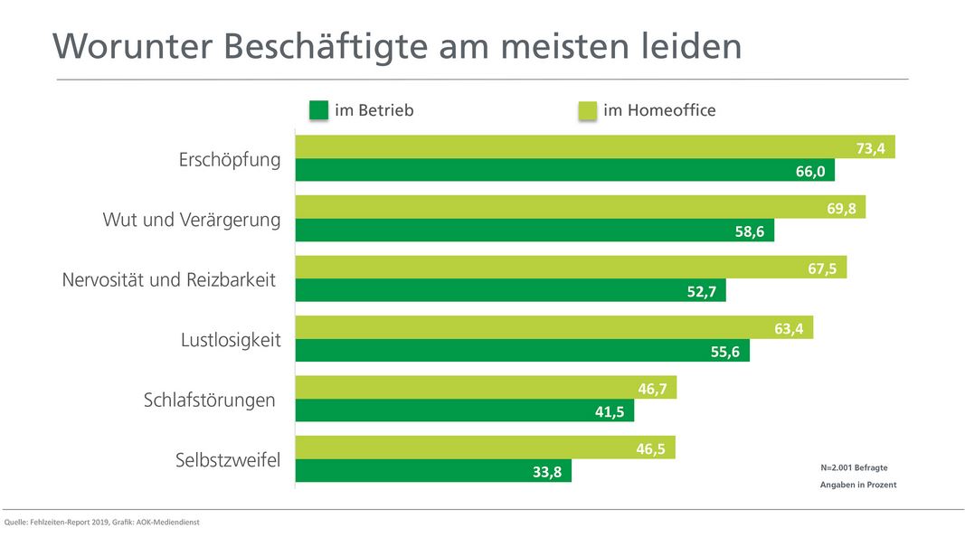 Laut Studie fühlten sich 73,4 Prozent der Befragten, die häufig im Homeoffice arbeiten, in den letzten vier Wochen erschöpft. Bei Beschäftigten, die ausschließlich im Büro tätig sind, waren es nur 66 Prozent. Über Wut und Verärgerung klagten 69,8 Prozent der Beschäftigten im Homeoffice gegenüber 58,6 Prozent; bei Nervosität und Reizbarkeit waren es im Homeoffice 67,5 Prozent im Vergleich zu 52,7 Prozent. Auch Lustlosigkeit, Konzentrationsprobleme und Schlafstörungen unterscheiden sich deutlich zwischen den beiden Gruppen. „Im Homeoffice verschwimmt die Grenze zwischen Job und Privatleben stärker. Damit wächst das Risiko, dass Erholungsphasen schrumpfen“, so begründet das Studien-Herausgeber Schröder.