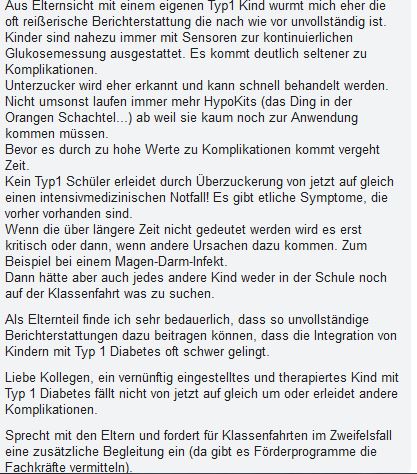 Selber Vater eines ähnlichen Typ 1 Diabetes Kindes frage ich mich wo die Fürsorge bzw. Kommunikationspflicht der Eltern hinterfragt wird. Nie haben wir ihn ohne persönliches Gespräch mit den Lehrern fahren lassen. Dadurch gab es in all den Jahren auf allen Fahrten nie Probleme. Gerade auch eine Insulinpumpe arbeitet nicht fehlerfrei und kann verstopfen, es braucht Vorsorge für Notfälle. Betreuungspersonen und auch Mitschüler brauchen eine kleine Unterweisung worauf zu achten ist. Dieses hat bei allen Beteiligten zu einem hohen Maß an Sicherheit geführt und dem Kind ein großes Maß an Freiheit und Förderung der Eigenständigkeit beschert. Insgesamt bleiben daher bei diesem tragischen Fall viele Fragen offen. Scheinbar hat es bisher auch noch kein Schulministerium geschafft einen einheitlichen Fragebogen für Klassenfahrten zu entwickeln und läßt die Lehrer – mal wieder – in der konkreten Arbeit allein. In all den Jahren habe ich jedenfalls noch nicht zwei identische Bögen ausgefüllt.