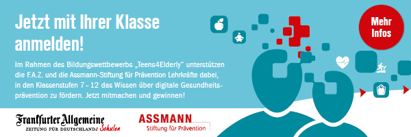 Im Rahmen des Bildungswettbewerbes „Teens4Elderly“ unterstützen die Assmann-Stiftung für Prävention und die F.A.Z. die Lehrkräfte dabei, in den Klassenstufen 7 bis 12 digitale Gesundheitskompetenz zu fördern. Alle Teilnehmer des Wettbewerbs Teens4Elderly erhalten kostenlos ein Informationspaket.